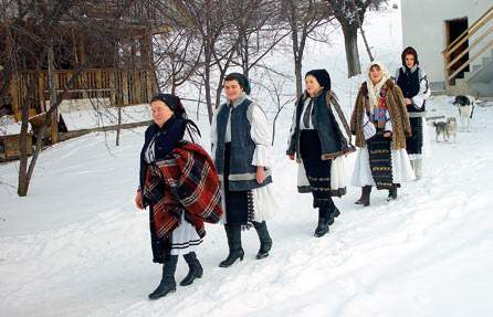 Iar dincolo de trosnetul butucilor ce ard în vetre, răzbat glasurile vesele ale copiilor ce se pornesc prin sat cu "bizăreaua". Obicei vechi, colindul acesta poate să mute munţii din loc şi să alunge toate duhurile rele anuţând, de sute de ani, Naşterea Domnului. "Noi ieşim, Dumnezeu intră!", spun copiii după ce-şi strâng în trăistuţele cusute cu fir roşu sau albastru, câteva mere şi nuci, iar de la gospodinele vrednice şi câteva felii de cozonac umplute nu doar cu rahat sau nuci (după cum se fac la câmpie), ci şi cu gem de fructe de pădure (că doar aici e patria ursului cel lacom a pofti la dulce!). Spre lăsarea serii, creştinii deschid porţile pentru a-i primi în bătătură pe "crai", şapte tineri moţi care ştiu a colinda şi cânta, recompunând povestea magică a pruncului Iisus şi a celor trei magi de la răsărit.